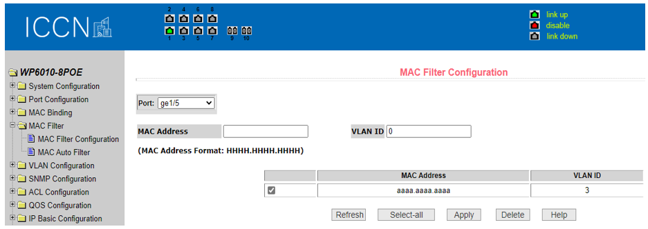 To configure MAC filtering in web GUI, navigate to MAC Filter → MAC Filter Configuration, choose the port on which MAC-Filtering is to be configured, specify the MAC address to be blocked (filtered), enter the VLAN ID and click ‘Apply’. The format for MAC address entry is ‘hhhh.hhhh.hhhh’. An example is shown below where aaaa.aaaa.aaaa is filtered on interface ge1/5.